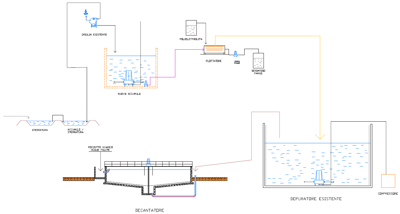 Schema di principio di un intervento di potenziamento e ottimizzazione di un impianto esistente di depurazione industriale per il trattamento delle acque reflue